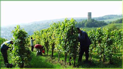 Foto rechts: Weinlese nahe der Burgruine Scharfenstein im gemeindeeigenen “Weinberg der Ehe” , der vom Weingut J. Steinmacher betreut wird.